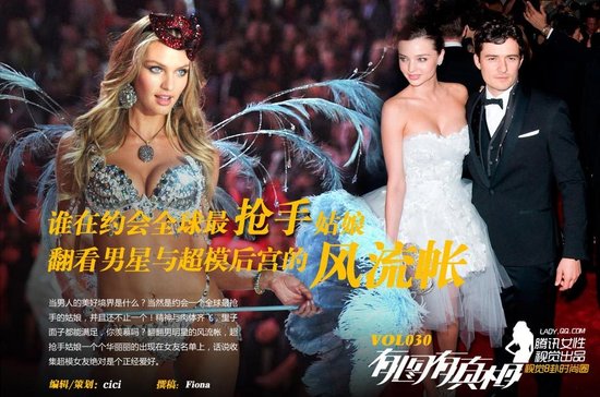 当男人的美好境界是什么?当然是约会一个全球最抢手的姑娘,并且还不止一个!精神与肉体齐飞,里子面子都能满足,你羡慕吗?翻翻男明星的风流帐,超抢手姑娘一个个华丽丽的出现在女友名单上,话说收集超模女友绝对是个正经爱好。
