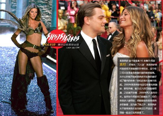 谁在约会全球最抢手的姑娘 (4) 莱昂纳多·迪卡普里奥 VS 吉赛尔·邦辰。好莱坞“万人迷”莱昂纳多绝对是维密天使超模的头号粉丝,迄今有三任女友是金发美胸长腿的维密超模。从什么时候开始莱昂纳多对名模的喜好成了圈内的传奇?恐怕还得从吉赛尔说起。2000年莱昂纳多与这位有着完美胸部、野性热情、魅力过人的巴西超模相遇,之后展开恋情,2006年两人宣布分手。虽然如今邦辰早已结婚生子,但仍有很多人都相信,邦娘娘始终是莱昂纳多的挚爱,因为除了她之外,莱昂纳多从不曾带其他女友出席过公开活动,更别提一起走红毯秀恩爱了。