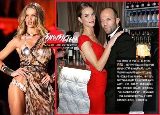 谁在约会全球最抢手的姑娘 (8) 杰森·斯坦森 VS 罗茜·汉丁顿·惠特莉。硬汉动作明星杰森·斯坦森与超模罗茜·汉丁顿·惠特莉目前已交往2年,不过从种种的狗仔队镜头中可以看到,两人仍置身于热恋的缠绵中。去年因为取代了梅根·福克斯之后担任新任《变形金刚3》女郎,罗茜·汉丁顿·惠特莉继而爆红。更被英国《男人帮》杂志票选为“2011全球最性感女星”。美女配英雄,杰森·斯坦森与超模罗茜·汉丁顿·惠特莉是当前好莱坞又一对惹眼情侣。