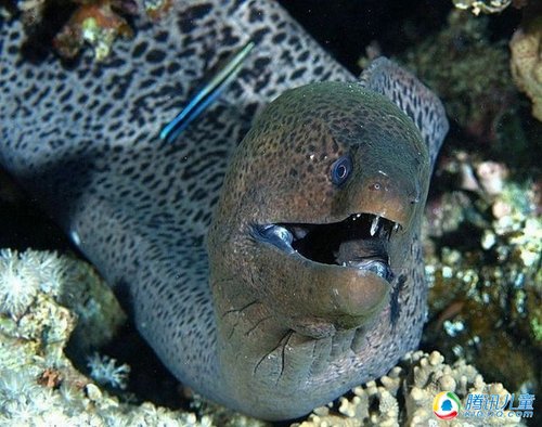 康吉鳗脑袋大,嘴巴宽,牙齿强壮有力,拥有不可小觑的捕猎能力。